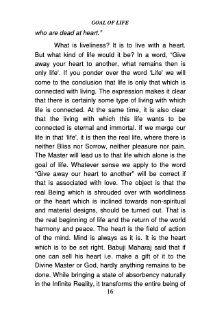 GOAL OF LIFE\u000Aan individual. It is this spiritual transformation of the individual, which is the expression of Divinity in the world of manifestation. It is This Divinity - God which is the Real goal of human life.\u000AThere are various conceptions of the Ultimate Reality - God. People look upon Him differently according to their capacity and understanding. The most commonly accepted conception of God is Eternal Power. But philosophic view includes the idea of Nirguna Brahman (Indeterminate Absolute) which is above all multiplicity and distinction. It is beyond quality, activity and consciousness. This Nirguna Brahman is regarded to be the Ultimate Cause and substratum of existence; the super active Centre of entire manifestation. It is also known as Para Brahman. With this comes another conception - the idea of God as Supreme Existence. We see the universe with all its diversities and differentiations and we are led to believe in it\u0027s creator and controller. We call Him Iswara or Saguna Brahman (Determinate Absolute) - also known as Apara Brahman. We think of Him as an Eternal Existence - Omnipotent and omniscient, possessing all finest attributes. It is only when viewed from the lower levels that God (as the God of religion) becomes an object of worship - final approach of almost all religions. While there is much debate on and large\u000Afollowing for both these conceptions, Babuji Maharaj\u000A17\u000A