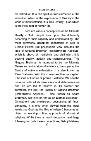 GOAL OF LIFE\u000Ain a Masterly stroke said that \u201CTruly God is neither Nirguna nor Saguna but beyond both; He is what He is\u201D. It is we who conceive him as Nirguna and make him Saguna. We must fix our view on the Original Element (Adi Tattva) - be it Nirguna or Saguna; whatever It is we must love It.\u000ASo long we remain confined within the bounds of the religion, we remain entangled with one or the other view of Gods\u0027 conception. The highest spiritual attainment is possible only when we go beyond the limits of religion. In fact spirituality begins where religion ends. Religion is only a preliminary stage for preparing a man for his march on the path of freedom from bondage. Revered Babuji Maharaj said \u201CThe end of religion is the beginning of spirituality; the end of spirituality is the beginning of Reality; and the end of Reality is the Real Bliss. When that too has gone, we have reached the destination - God\u201D. Thus, God is not to be found within the folds of a particular religion or sect. He is neither confined within certain forms or rituals nor is He to be traced within the scriptures or Holy books. Him we have to seek in the inner most core of our hearts. Really God is very simple and plain. He is not in solid form. There is no solidity of any kind in Him. God is simple and extremely subtle. In fact, the very simplicity and purity of the Ultimate\u000Ahas become a veil to it. It is this Ultimate - God that\u000A18\u000A