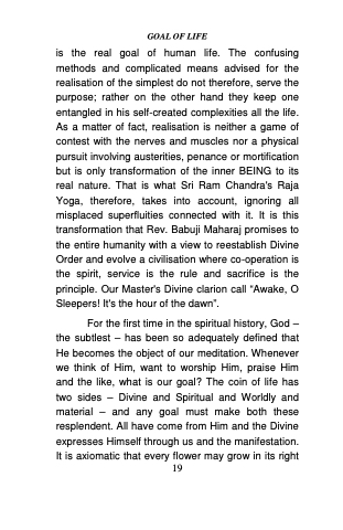 GOAL OF LIFE\u000Astandard and every soul must live a happy and restful life. Firstly, each one of us must play the role carved out by Him in this world in accordance with the law of Nature. Each one of us, individually, must therefore, first identify the Mission of Life; it is part of the Goal. Secondly but more importantly, it is the bounden duty of every human being to reach Him and regain one\u2019s original state of being \u2018one with Him\u2019. The goal set by the Master meets the core requirements of thse two concurrent missions of life \u2018totally and effectively\u2019. This makes life an integral whole, it is not really the worldly living that is detrimental to the Natural Path but only our wrong ways of living that impede spiritual progress. This path bestowed by the Master is a \u2018way of life\u2019 \u2013 in total harmony with the Nature.\u000ARevered Babuji has laid down that Divine Light without luminosity in the heart where it beats be the object of meditation. He avers that in the absence of adequate human vocabulary, everyone has expressed the Divine as Light. But the Master adds a rider \u2013 Divine Light without luminosity, which is incomprehensible to physical faculties and gross senses. To be attracted by and be absorbed in this Divine Light is the beginning of spiritual journey of the abhyasi. All sincere sadhakas of the Natural Path have imperienced this Divine Light and many\u000Ahave grown to such higher levels of consciousness\u000A20\u000A