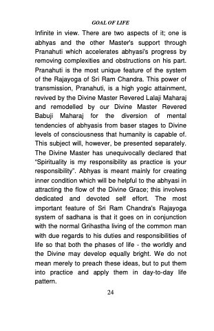 ROLE OF ABHYASI\u000ASome questions invariably crop up in our minds that under the system what are the true and important role(s) of an abhyasi? What is to be done to become deserving to receive the Divine Grace of the Master? What are the major ingredients of worldly conduct so that we can carry out both spiritual and worldly phases of life with equanimity and balance? Answers to these may reflect in us and indicate the broad parameters of the role of an abhyasi in our system. In fact, Babuji Maharaj after 25 years of the introduction of the system thought about issuing a hand-out outlining the role of an abhyasi during 1981. The need arose mainly because of lack of proper understanding of the system and its practices as such. It will therefore, be our endeavour to put across various aspects on the subject as compiled from the works of the Divine Master. It is proposed to analyse each factor relevant to the issue separately so that we can gauge them in correct perspective and \u201CMould our living so as to rouse a feeling of love and piety in others\u201D. That will be the \u201CEssence of the Sadhana\u201D of an abhyasi which will lead to the fulfilment of the spiritual goal and conduct of ourselves as a discIplined soldier of the system of Sri Ram Chandra\u0027s Rajayoga.\u000A25\u000A