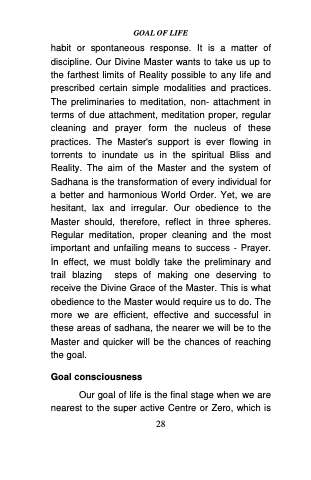 ROLE OF ABHYASI\u000Athe primeval cause of the entire manifestation and to which every soul ultimately returns after Maha Pralaya. To obviate the series of births and save ourselves from the miseries of innumerable lives, we want to create our own individual Pralaya and acquire a state of complete dissolution of all things of our own making. We have to be free from all Samskaras acquired throughout the existence and assume the same pure form in which we were at the time of creation. This is what will be achieved when we say \u201CO Master! Thou art the real goal of human life\u201D. It is oneness with the Master. It remains for us to play the part of a true seeker and adopt means helpful in attaining the goal. There are three signs which indicate our approach nearing the goal. They are Divine Action, Divine Wisdom and Divine Thought. We must try to develop these in us. This is what is Divinisation. All senses and faculties are in total harmony assuming their original state and are merged in the real. The final state of Divinisation comes when every atom of the body becomes one with the Master - the Ultimate. \u201COneness with the God\u201D. We need to be crystal clear of the goal and keep it always in sight when carrying out meditational practices and conducting our world affairs. Then only it becomes relevant to a common man and that is the beginning of the Divinity expressing itself in us.\u000A29\u000A