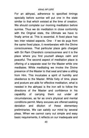 ROLE OF ABHYASI\u000Aincomplete understanding of the System as such; our faith in spiritual upliftment itself becomes questionable. We need to make up our mind with a firm Sankalpa, then we can easily undertake these simple acts with greater understanding, willingness and regularity. This is the role we must set for ourselves.\u000AAs long as we do not remove grossness settled in our Spiritual Centres, the grace or effect of higher centres remains far apart due to the grossness and complexities we have accumulated. Our system of sadhana recommends the modalities and methods for cleaning of the Centres and the entire spiritual system itself. Though the Master Himself attends to this through the process of Transmission, each abhyasi has dynamic and particularised role in effecting this cleaning. The Master\u0027s support in this regard is comprehensive, but the role of the abhyasi is pivotal. Aspirants do not evince interest in \u2018cleaning process\u0027, probably because of their lingering attachment to what is being cleaned, nor do they feel much interested in meditation when the cleaning process is being effected and impressions and bondages are being loosened by the Master. As this is the only effective course for getting subtler, lighter and \u201CSookshma\u201D day by day to secure Union with the subtlest, we\u000Ahave to pay utmost attention and ensure regular\u000A41\u000A