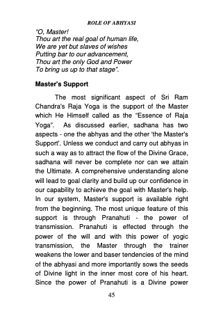 GOAL OF LIFE\u000Aworking through the channels of pure mind, the Master awakens and accelerates the dormant forces in the abhyasi to action and diverts the flow of the Divine currents towards the heart and of consciousness from the heart to the Atman Point. This is the Master\u0027s Divine role and spiritual responsibility. When we know our role, we need to be fully aware of Master\u0027s support and make preparations to receive his Grace by being deserving as well as spiritually attracting. By connecting ourselves with Him with obedience, love and devotion, we also begin to transform accordingly. In addition, the Master attends to the cleaning of the System by removing Mal (grossness), Vikshep (fickleness), and Avaran (covering) of the body, mind and the soul - in our march from gross to subtler levels. It depends on the abhyasi to extract from the Master as much as he can through love and devotion. The greater the intensity of devotion and surrender, the stronger will be the force flowing into him. The abhyasi has only to prepare himself to receive His Grace by making himself capable and deserving of it. This is the role of the abhyasi. Spiritual training for the attainment of higher stages is only possible by the process of Yogic Transmission and by no other means. Sri Ram Chandra\u0027s Raja Yoga is the only means presently available for the attainment of the highest - the\u000A46\u000A