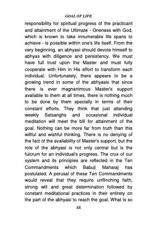 ROLE OF ABHYASI\u000Aspectacular of our system is the certainty of achieving the goal of Oneness with God with ever flowing Master\u0027s support PROVIDED an abhyasi makes himself deserving by love, devotion, sharing and sacrifice in addition to the adherence to the Ten Commandments. These are the practical aspects of abhyas and inter se relationship between the Master\u0027s support and the role of an abhyasi.\u000AConstant Remembrance\u000AConstant remembrance of God is, of course, a special feature in spirituality. The method for cultivating constant remembrance is to think with firm conviction during your leisure hours, whether in office or at home, in the street or in the market, that God is pervading all over and everywhere, and that you are always thinking of Him. This thought should be maintained as long as possible until all worldly responses are influenced by such consciousness. Unfortunately, the issue of constant remembrance is misunderstood in our system. It is not that we go on repeating the name of Babuji Maharaj, as if it is some sort of a mantra. If we are going to repeat His name several times just like a mantra, grossness will be developed. This grossness is of a peculiar variety which is of a finer nature. Both the abhyasi and trainer will not generally have any inclination to remove such grossness of superfine nature. A thin\u000A49\u000A