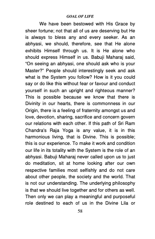 ROLE OF ABHYASI\u000AScheme of Nature. The tolerance and respect towards all can never develop unless we have assimilated the fundamental understanding of fraternity. This fraternity is possible because of our common cosmic parenthood and Origin. If we comprehend the common spiritual source from which we have evolved and feel the commonness in our hearts, then it will become natural for us. Otherwise it is artificial, remains a catch word and will just be a lip service as is generally the case with most of us. Everybody - the politician, the social worker and the religious teacher - has talked about this; nothing is new about the idea itself. But to live with that idea as an integral part of our life itself and practice it as such, we require sadhana and this is what Sri Ram Chandra\u0027s Raja Yoga aims at. This sadhana must be underlined with total love and Message of the Master.\u000AWhen every one of us lives his life in unison, in cooperation and in conformity with the Nature as well as all other people, then, that alone becomes Divine life. Whatever little we have, let us share with somebody else including some agony. In case, it comes to us we should not say that our need is not taken care of. This concept of sharing is lost mainly because we have understood our needs to be absolutely individual and as not something that is\u000Ashared by all of us. An analysis of rapidly declining\u000A59\u000A