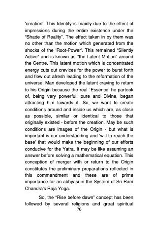 personalities alike. The environment before the creation, there was neither heat nor cold, neither day nor night, neither light nor dark. It was what it was. The closest thing that we may conceive is what lies between those two sets of contradictions - at the end of the one and before the advent of the other. In fact, it could be the meeting point of these two. Motion (activity) and heat - through inter action and counter action - impacted on the subtlest particles leading to the formation of the universe of animate and inanimate things. These things get, therefore, influenced by the heat produced by external causes including the sun. Now, the time when the external heat begins to subside, yielding place for the cooler effect to settle in, or the meeting point between these two is known as \u201CSandhi Gathi\u201D and this is known to be best time for the practice of Puja. This is the time of the advent of that which is opposed to heat and it can be that alone which existed prior to the generation of heat at the time of creation and which is in close conformity with Nature. In other words, this is the image or reflection of the Ultimate state we have to finally arrive at. Thus, the environment, space or external atmospheric conditions or point we start from is verily that which corresponds closely with the Destination. Besides, performing of meditation before sunrise is stressed upon for the reason that the external and other\u000A71\u000A