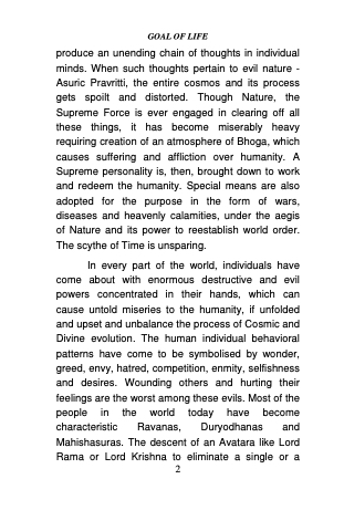 GOAL OF LIFE\u000Agroup of Asuras is not the answer. Individual transformation is the only solution. As a matter of fact, world peace can never be possible unless we take into account the inner state of individual mind. World peace is directly related to individual peace, for which the individual mind is to be brought up to the required level. If the individual mind is brought to a state of rest and peace, everything in the world will, then, appear to him in the same colour. It is, therefore, essential to find out means for developing within every individual a state of peace, contentment and moderation. That is the only way for bringing peace into the world. The development of peace of mind within individual self is the first and the most important step now to restore balance in the world. But that being exclusively the scope of spirituality, one must necessarily resort to spiritual means for the purpose. Indeed, the problem of the Universe is the problem of the individual. Those who speak of Sarva Mukti (simultaneous Universal emancipation) hardly try to achieve their own liberation for it is verily the Truth that the individual emancipation is the first step towards Universal harmony and peace.\u000AGreat men are not accidentally born. They are born when world waits for them in eager expectation. Such is the phenomenon of Nature. At the time when spirituality was tottering helplessly\u000Aand the solid materialism had usurped the position\u000A3\u000A