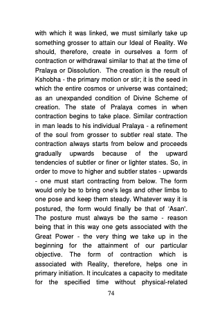 diversions - over a period of time. The performance of Sandhya and meditation in an upright sitting position - with the back bone, neck and head in erect straight line - has been thought to be most advantageous from very ancient times;; because the flow of Divine grace is believed to descend straight upon the abhyasi in that posture. In our system of Meditation, this is not insisted upon. The abhyasi should sit in a natural easy posture. Moreover, even though those who assume a tight straight pose are found to give away automatically to a suppliant, slightly forward drooping posture, as a state of blissful absorbency sets in. As such, it may be considered to be more natural even for the purpose of an ascent into higher states of consciousness. If an abhyasi, sits crookedly or obliquely or in an unsteady pose, the flow of Divine effulgence will necessarily be impeded or disturbed. The posture adopted should generally be the same so that we get used to for unchanging or disciplined presentation of ourselves before the Divinity evoking feelings of our association and connection with the Base or Ultimate. This is essential. There is another angle to the Asana. It is related to the purpose of creation. The purpose of creation is, the Divinity wanted to express Itself, It has manifested Itself in so many forms, It never wanted these forms to express themselves. Each and every one of these\u000A75\u000A