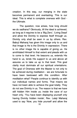Divinity to be seen by others\u0027. This is what sadhakas should strive for.\u000ACOMMANDMENT 4\u000A\u201CBE PLAIN AND SIMPLE TO BE IDENTICAL WITH NATURE\u201D.\u000AThis apparently open and direct command has lot of special significance. If we have to be identical with the Nature, which is pure, sacred, primeval and unadulterated and unpolluted subtlest thing, we have to be plain and simple. The plainness which is transparent and which is in its original state is what is being called for. At the time of creation, the perfect calmness, a type of see-through transparency and plain nature - was disturbed by the effect of the Primary Stir leading to the formation of forms. All the created things had the effect or reflections of the Real Power. Gradually, the power inherited by one began to develop and the same original thought that caused the Primary Stir, being present in man, started to manifest itself in proportion to its magnitude. It commenced to display its actions similar to those related to the Divine. Thus, man took up a contrary trend and began to build his own creation. Though action in the Divine manifestation and man\u0027s own network of individual creation is the same, in respect of plainness and\u000Apurity, it was an absolute contrast to the Divine and\u000A92\u000A