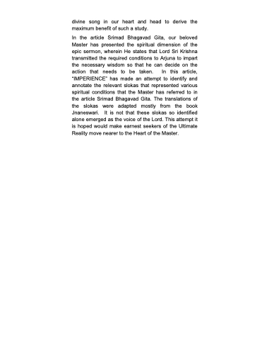 In the article Srimad Bhagavad Gita, our beloved Master has presented the spiritual dimension of the epic sermon, wherein He states that Lord Sri Krishna transmitted the required conditions to Arjuna to impart the necessary wisdom so that he can decide on the action that needs to be taken. In this article, “IMPERIENCE” has made an attempt to identify and annotate the relevant slokas that represented various spiritual conditions that the Master has referred to in the article Srimad Bhagavad Gita. The translations of the slokas were adapted mostly from the book Jnaneswari. It is not that these slokas so identified alone emerged as the voice of the Lord. This attempt it is hoped would make earnest seekers of the Ultimate Reality move nearer to the Heart of the Master.