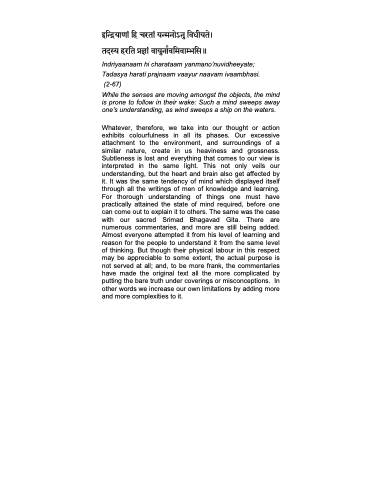 Whatever, therefore, we take into our thought or action exhibits colourfulness in all its phases. Our excessive attachment to the environment, and surroundings of a similar nature, create in us heaviness and grossness. Subtleness is lost and everything that comes to our view is interpreted in the same light. This not only veils our understanding, but the heart and brain also get affected by it. It was the same tendency of mind which displayed itself through all the writings of men of knowledge and learning. For thorough understanding of things one must have practically attained the state of mind required, before one can come out to explain it to others. The same was the case with our sacred Srimad Bhagavad Gita. There are numerous commentaries, and more are still being added. Almost everyone attempted it from his level of learning and reason for the people to understand it from the same level of thinking. But though their physical labour in this respect may be appreciable to some extent, the actual purpose is not served at all; and, to be more frank, the commentaries have made the original text all the more complicated by putting the bare truth under coverings or misconceptions. In other words we increase our own limitations by adding more and more complexities to it.