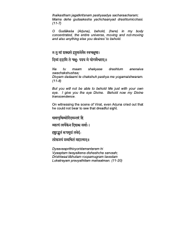 Ihaikastham jagatkritsnam pashyaadya sacharaacharam; Mama dehe gudaakesha yachchaanyad drashtumicchasi. (11-7)