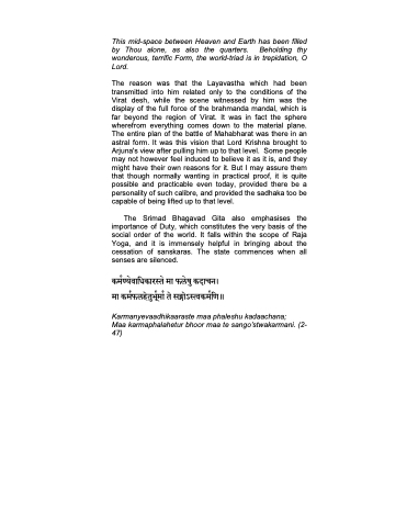 The reason was that the Layavastha which had been transmitted into him related only to the conditions of the Virat desh, while the scene witnessed by him was the display of the full force of the brahmanda mandal, which is far beyond the region of Virat. It was in fact the sphere wherefrom everything comes down to the material plane. The entire plan of the battle of Mahabharat was there in an astral form. It was this vision that Lord Krishna brought to Arjuna's view after pulling him up to that level. Some people may not however feel induced to believe it as it is, and they might have their own reasons for it. But I may assure them that though normally wanting in practical proof, it is quite possible and practicable even today, provided there be a personality of such calibre, and provided the sadhaka too be capable of being lifted up to that level.