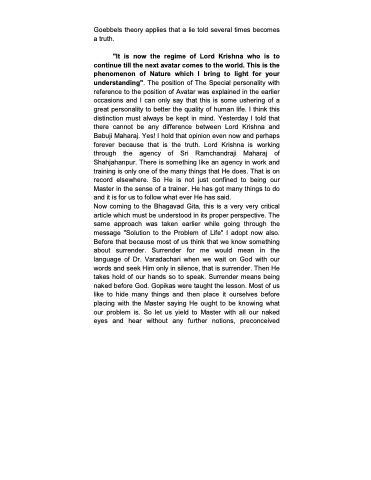 "It is now the regime of Lord Krishna who is to continue till the next avatar comes to the world. This is the phenomenon of Nature which I bring to light for your understanding". The position of The Special personality with reference to the position of Avatar was explained in the earlier occasions and I can only say that this is some ushering of a great personality to better the quality of human life. I think this distinction must always be kept in mind. Yesterday I told that there cannot be any difference between Lord Krishna and Babuji Maharaj. Yes! I hold that opinion even now and perhaps forever because that is the truth. Lord Krishna is working through the agency of Sri Ramchandraji Maharaj of Shahjahanpur. There is something like an agency in work and training is only one of the many things that He does. That is on record elsewhere. So He is not just confined to being our Master in the sense of a trainer. He has got many things to do and it is for us to follow what ever He has said.