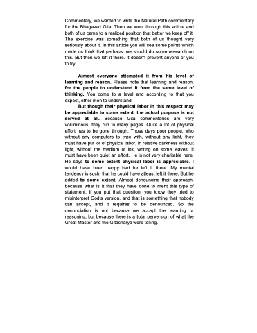 Commentary, we wanted to write the Natural Path commentary for the Bhagavad Gita. Then we went through this article and both of us came to a realized position that better we keep off it. The exercise was something that both of us thought very seriously about it. In this article you will see some points which made us think that perhaps, we should do some research on this. But then we left it there. It doesn't prevent anyone of you to try.