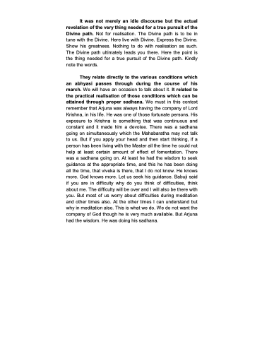 They relate directly to the various conditions which an abhyasi passes through during the course of his march. We will have an occasion to talk about it. It related to the practical realisation of those conditions which can be attained through proper sadhana. We must in this context remember that Arjuna was always having the company of Lord Krishna, in his life. He was one of those fortunate persons. His exposure to Krishna is something that was continuous and constant and it made him a devotee. There was a sadhana going on simultaneously which the Mahabaratha may not talk to us. But if you apply your head and then start thinking, if a person has been living with the Master all the time he could not help at least certain amount of effect of fomentation. There was a sadhana going on. At least he had the wisdom to seek guidance at the appropriate time, and this he has been doing all the time, that viveka is there, that I do not know. He knows more. God knows more. Let us seek his guidance. Babuji said if you are in difficulty why do you think of difficulties, think about me. The difficulty will be over and I will also be there with you. But most of us worry about difficulties during meditation and other times also. At the other times I can understand but why in meditation also. This is what we do. We do not want the company of God though he is very much available. But Arjuna had the wisdom. He was doing his sadhana.