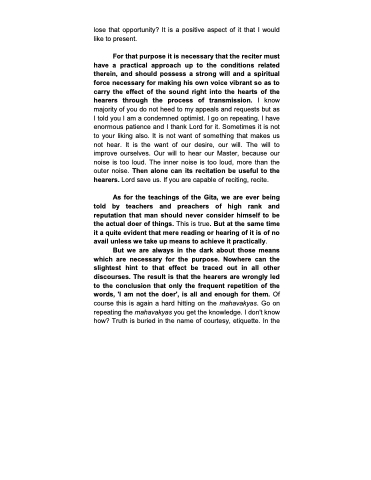 But we are always in the dark about those means which are necessary for the purpose. Nowhere can the slightest hint to that effect be traced out in all other discourses. The result is that the hearers are wrongly led to the conclusion that only the frequent repetition of the words, 'I am not the doer', is all and enough for them. Of course this is again a hard hitting on the mahavakyas. Go on repeating the mahavakyas you get the knowledge. I don't know how? Truth is buried in the name of courtesy, etiquette. In the