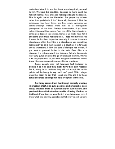 understand what it is, and this is not something that you read to him. We have this condition. Because we have learnt the habit of hearing, most of us are not responding to the request. That is again one of the blemishes. But people try to hear rather than participate. I don't know why because I think the prasangas have been there, and then made everybody an adhika-prasangi. Instead there can be a bodhayanthi parasparam all the time. Today's transmission, if you have noted, it is something coming from one of the highest regions, giving us a taste of the silence. Some of us might have felt it and some of us might not have felt it. Those who have not felt it would be for them to ponder over why it is so or is such a disturbance which they think is a disturbance was something that is really so or is their reaction to a situation. It is for each one to understand. I think that type of dialogue has to start, if you want to proceed further in the path. Even Gita is a dialogue. It is not one way. It is a dialogue. But why dialogue is lost? Why gurus are asked to go on talking all the time. Why is it we are prepared to be just mum like goats and sheep. I don't know. I have no answers for some of those questions.