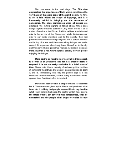We now come to the next stage. The Gita also emphasizes the importance of Duty, which constitutes the very basis of the social order of the world. So duty we have to do. It falls within the scope of Rajayoga, and it is immensely helpful in bringing out the cessation of samskaras. The state commences when all senses are silenced, the indriya nigraha is talked about. When does indriya nigraha become possible? Only when we do it as a matter of service to the Divine. If all the indriyas are dedicated only to the service of the Divine even while discharging our duty to our family members and to the society, then that person is considered an indriya nigraha. Not a person who sits on the top of a tree and then says all my indriyas are under control. Or a person who simply floats himself up in the sky and then says I have got indriya nigraha. All sorts of ideas are there. But that is not indriya nigraha, actually they are people enjoying the indriyas.