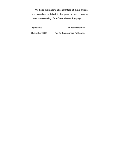 We hope the readers take advantage of these articles and speeches published in this paper so as to have a better understanding of the Great Masters Rajayoga. Hyderabad R.Radhakrishnan September 2018 For Sri Ramchandra Publishers