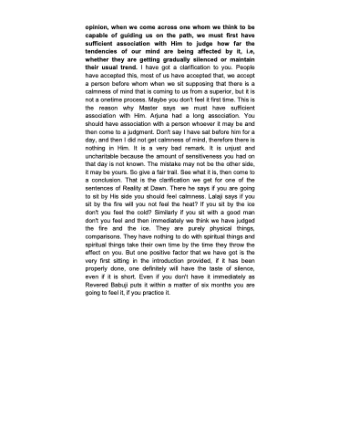 opinion, when we come across one whom we think to be capable of guiding us on the path, we must first have sufficient association with Him to judge how far the tendencies of our mind are being affected by it, i.e, whether they are getting gradually silenced or maintain their usual trend. I have got a clarification to you. People have accepted this, most of us have accepted that, we accept a person before whom when we sit supposing that there is a calmness of mind that is coming to us from a superior, but it is not a onetime process. Maybe you don't feel it first time. This is the reason why Master says we must have sufficient association with Him. Arjuna had a long association. You should have association with a person whoever it may be and then come to a judgment. Don't say I have sat before him for a day, and then I did not get calmness of mind, therefore there is nothing in Him. It is a very bad remark. It is unjust and uncharitable because the amount of sensitiveness you had on that day is not known. The mistake may not be the other side, it may be yours. So give a fair trail. See what it is, then come to a conclusion. That is the clarification we get for one of the sentences of Reality at Dawn. There he says if you are going to sit by His side you should feel calmness. Lalaji says if you sit by the fire will you not feel the heat? If you sit by the ice don't you feel the cold? Similarly if you sit with a good man don't you feel and then immediately we think we have judged the fire and the ice. They are purely physical things, comparisons. They have nothing to do with spiritual things and spiritual things take their own time by the time they throw the effect on you. But one positive factor that we have got is the very first sitting in the introduction provided, if it has been properly done, one definitely will have the taste of silence, even if it is short. Even if you don't have it immediately as Revered Babuji puts it within a matter of six months you are going to feel it, if you practice it.