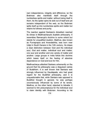 own independence, integrity and difference, so the Brahman also manifests itself through the numberless spirits and matter, without losing itself in them. As the spider spins its web out of itself and yet remains independent of the web, so the Brahman splits itself up into numberless spirits and matter but retains its fullness and purity.