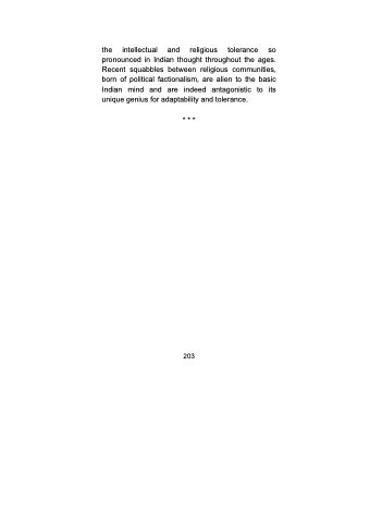 the intellectual and religious tolerance so pronounced in Indian thought throughout the ages. Recent squabbles between religious communities, born of political factionalism, are alien to the basic Indian mind and are indeed antagonistic to its unique genius for adaptability and tolerance.