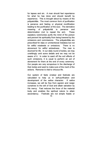 for lapses and sin. A man should feel repentance for what he has done and should benefit by experience. This is brought about by means of the prāyaścittās. The most common form of purification is penance and fasting or physical mortification leading to the purification of the soul. The derivative meaning of prāyaścittā is penance and determination (not to repeat the act). These expiatory ceremonies purify the mind of the person and prevent his spirituality from being lowered by the omissions and commissions. The prāyaścittāa are prescribed for slips or unintentional mistakes but not for willful misdeeds or omissions. There is no atonement for willful wickedness. The man is doomed for life. In our daily round of duties, we may unwittingly omit some details and we may not be aware of it. In order to ward off the evil effects of such omissions, it is usual to perform an act of atonement for them at the end of every ceremony. Our people are very scrupulous in the discharge of their duties and want to make sure of the merit of the actions. Remorse is vital to virtuous life.