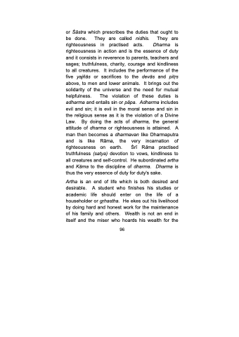 or Śāstra which prescribes the duties that ought to be done. They are called nidhis. They are righteousness in practised acts. Dharma is righteousness in action and is the essence of duty and it consists in reverence to parents, teachers and sages; truthfulness, charity, courage and kindliness to all creatures. It includes the performance of the five yajñās or sacrifices to the devās and pitṛs above, to men and lower animals. It brings out the solidarity of the universe and the need for mutual helpfulness. The violation of these duties is adharma and entails sin or pāpa. Adharma includes evil and sin; it is evil in the moral sense and sin in the religious sense as it is the violation of a Divine Law. By doing the acts of dharma, the general attitude of dharma or righteousness is attained. A man then becomes a dharmavan like Dharmaputra and is like Rāma, the very incarnation of righteousness on earth. Śrī Rāma practised truthfulness (satya) devotion to vows, kindliness to all creatures and self-control. He subordinated artha and Kāma to the discipline of dharma. Dharma is thus the very essence of duty for duty's sake.