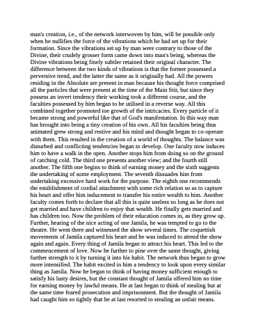 man's creation, i.e., of the network interwoven by him, will be possible only when he nullifies the force of the vibrations which he had set up for their formation. Since the vibrations set up by man were contrary to those of the Divine, their crudely grosser form came down into man's being, whereas the Divine vibrations being finely subtler retained their original character. The difference between the two kinds of vibrations is that the former possessed a perversive trend, and the latter the same as it originally had. All the powers residing in the Absolute are present in man because his thought force comprised all the particles that were present at the time of the Main Stir, but since they possess an invert tendency their working took a different course, and the faculties possessed by him began to be utilised in a reverse way. All this combined together promoted toe growth of the intricacies. Every particle of it became strong and powerful like that of God's manifestation. In this way man has brought into being a tiny creation of his own. All his faculties being thus animated grew strong and restive and his mind and thought began to co-operate with them. This resulted in the creation of a world of thoughts. The balance was disturbed and conflicting tendencies began to develop. One faculty now induces him to have a walk in the open. Another stops him from doing so on the ground of catching cold. The third one presents another view; and the fourth still another. The fifth one begins to think of earning money and the sixth suggests the undertaking of some employment. The seventh dissuades him from undertaking excessive hard work for the purpose. The eighth one recommends the establishment of cordial attachment with some rich relation so as to capture his heart and offer him inducement to transfer his entire wealth to him. Another faculty comes forth to declare that all this is quite useless so long as he does not get married and have children to enjoy that wealth. He finally gets married and has children too. Now the problem of their education comes in, as they grow up. Further, hearing of the nice acting of one Jamila, he was tempted to go to the theatre. He went there and witnessed the show several times. The coquettish movements of Jamila captured his heart and he was induced to attend the show again and again. Every thing of Jamila began to attract his heart. This led to the commencement of love. Now he further to pine over the same thought, giving further strength to it by turning it into his habit. The network thus began to grow more intensified. The habit excited in him a tendency to look upon every similar thing as Jamila. Now he began to think of having money sufficient enough to satisfy his lusty desires, but the constant thought of Jamila offered him no time for earning money by lawful means. He at last began to think of stealing but at the same time feared prosecution and imprisonment. But the thought of Jamila had caught him so tightly that he at last resorted to stealing an unfair means.