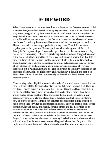 When I was asked to write a foreword for the book on the Commandments of Sri Ramchandraji, with the notes thereon by my husband, I was a bit confused as to why I was being asked by him to do the work. He knows that I am not fluent in English and when there are so many abhyasis who are more qualified to do the work. He said he has the notes on the Commandments of the Master and as to the fitness for writing the foreword he stated that I am the best person to do so as I have observed him for longer period than any other. True, I do not know anything about the system of Rajayoga, leave alone the system of Revered Babuji before my marriage. It was rather peculiar to me that even from the day one of our relationship, I observed him being assiduous about doingsadhana and at the age of 26 it was something I could not understand a person like that totally different from others. He said that the purpose of life is to realize God and we should endeavour to do this in our lives as a joint enterprise. As I am not aware of any philosophy and only know about some routine practices of worship according to Sri Vaishnavism and as I also know that he is highly qualified in the branches of knowledge of Philosophy and Psychology I thought the best is to follow him which I have done assiduously so far and to a large extent I am a satisfied person.
