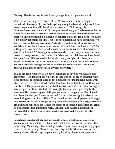 That is the main reason why we have been asked to develop Vairagya or due attachment? The meaning for Vairagya is that, it is not so much dejection with these people, but dejection with us, for not capable of maintaining purity with which we were created by God. "What fool have I been that I left my Home and I am here, left my source and am with all sorts of worms". That is the feeling we have deep in our heart. We feel like saying to the dear ones "you may be the most beautiful person, agreed. Still you are a worm compared to Him, I would not like to be with you, I want to get back", that is the feeling that arises in our heart during our march to Infinity. That is the basis for development of Vairagya. As a matter of fact, if we are going to question this concept of having committed a mistake and repenting for it, then the question of serfdom itself does not arise. So please note these impurities Mala, Vikshepa and Avarana about which Revered Babuji talks a lot, in other works, are there and it is our folly that created them.