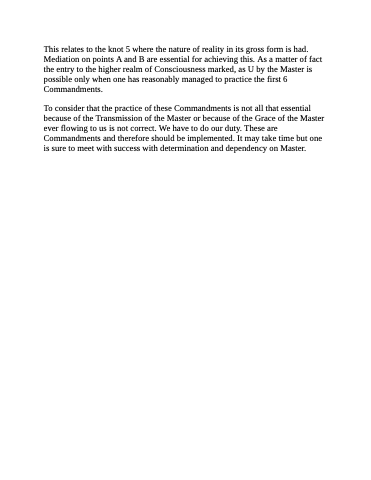 This relates to the knot 5 where the nature of reality in its gross form is had. Mediation on points A and B are essential for achieving this. As a matter of fact the entry to the higher realm of Consciousness marked, as U by the Master is possible only when one has reasonably managed to practice the first 6 Commandments.