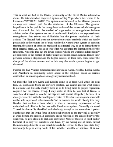This is what we had in the Divine personality of the Great Master referred to above. He introduced an improved system of Raj Yoga which later came to be known as 'NATURAL PATH'. The system now followed in the Mission presents an easy and natural path for the attainment of the Ultimate. The greatest impediment in the path is the unregulated action of the senses which have gone out of control. For this, the method of suppression or strangulation hitherto advised under older systems are not of much avail. Really it is not suppression or strangulation that solves our difficulties but the proper regulation of their actions. The Natural Path does not advise those cruder methods which are hardly practicable in the routine life of man. Under the Natural Path system of spiritual training the action of senses is regulated in a natural way so as to bring them to their original state, i.e. just as it was when we assumed the human form for the first time. Not only this but the lower vritties which are working independently are subjected to the control of higher centres of super-consciousness. Hence their perverse action is stopped and the higher centres, in their turn, come under the charge of the divine centres and in this way the whole system begins to get divinised.