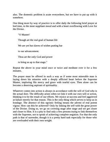 One thing more by way of practice is to offer daily the following brief prayer at bed time, in the most suppliant mood and with a heart overflowing with Love for the Divine.