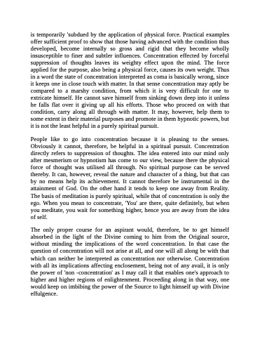 is temporarily 'subdued by the application of physical force. Practical examples offer sufficient proof to show that those having advanced with the condition thus developed, become internally so gross and rigid that they become wholly insusceptible to finer and subtler influences. Concentration effected by forceful suppression of thoughts leaves its weighty effect upon the mind. The force applied for the purpose, also being a physical force, causes its own weight. Thus in a word the state of concentration interpreted as coma is basically wrong, since it keeps one in close touch with matter. In that sense concentration may aptly be compared to a marshy condition, from which it is very difficult for one to extricate himself. He cannot save himself from sinking down deep into it unless he falls flat over it giving up all his efforts. Those who proceed on with that condition, carry along all through with matter. It may, however, help them to some extent in their material purposes and promote in them hypnotic powers, but it is not the least helpful in a purely spiritual pursuit.