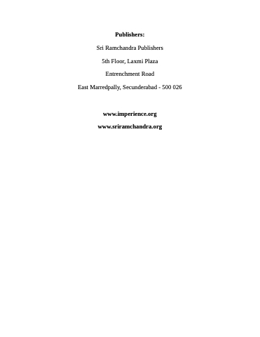 Publishers: Sri Ramchandra Publishers 5th Floor, Laxmi Plaza Entrenchment Road East Marredpally, Secunderabad - 500 026 www.imperience.org www.sriramchandra.org