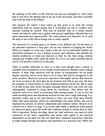 There is another difficulty as well. It is that even though such a master is available and accessible he is not usually trusted unless he displays some striking miracle. A Raja Yogi endowed with the power of transmission can no doubt display miracles, but he never likes to do so since that will be derogatory to his pious position. Moreover practical experience thoroughly proves that miracles are of no account at all, since they do not promote real faith in any way. We have the example of Christ before us, who displayed miracles all his life. But in spite of all that he got only twelve disciples amongst whom there was even one who subsequently contrived to bring about his crucifixion. That shows that his miracles were of no avail in promoting faith among people. It was in fact his noble teaching alone that afterwards secured for him such a large following. It is, therefore, better and in our best interest to have our eyes fixed upon Reality rather than upon miracles which are undoubtedly very petty affairs, and can be displayed by persons of inferior attainments and common talents. Miracle is no criterion for a saint or a yogi. It is, on the other hand, a deliberate fraud played by dexterous gurus upon the weak and credulous people to entrap them in their fold of gurudom. Before deciding, about the final selection, one must be fully convinced of the man's capabilities and merits with regard to his practical attainments on the path. For this one must have continued association with him to judge things through perception and experience in a practical way. When one