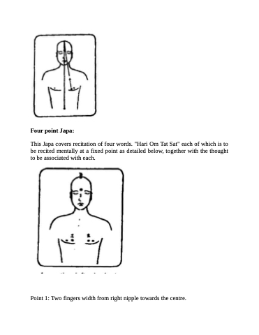 This Japa covers recitation of four words. "Hari Om Tat Sat" each of which is to be recited mentally at a fixed point as detailed below, together with the thought to be associated with each.