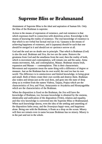 Attainment of Supreme Bliss is the ideal and aspiration of human life. Only the bliss of the Brahman is supreme.
