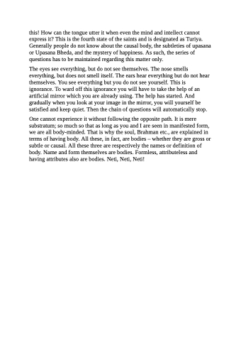 One cannot experience it without following the opposite path. It is mere substratum; so much so that as long as you and I are seen in manifested form, we are all body-minded. That is why the soul, Brahman etc., are explained in terms of having body. All these, in fact, are bodies – whether they are gross or subtle or causal. All these three are respectively the names or definition of body. Name and form themselves are bodies. Formless, attributeless and having attributes also are bodies. Neti, Neti, Neti!