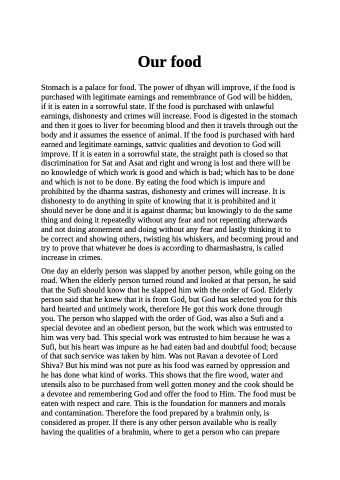 Stomach is a palace for food. The power of dhyan will improve, if the food is purchased with legitimate earnings and remembrance of God will be hidden, if it is eaten in a sorrowful state. If the food is purchased with unlawful earnings, dishonesty and crimes will increase. Food is digested in the stomach and then it goes to liver for becoming blood and then it travels through out the body and it assumes the essence of animal. If the food is purchased with hard earned and legitimate earnings, sattvic qualities and devotion to God will improve. If it is eaten in a sorrowful state, the straight path is closed so that discrimination for Sat and Asat and right and wrong is lost and there will be no knowledge of which work is good and which is bad; which has to be done and which is not to be done. By eating the food which is impure and prohibited by the dharma sastras, dishonesty and crimes will increase. It is dishonesty to do anything in spite of knowing that it is prohibited and it should never be done and it is against dharma; but knowingly to do the same thing and doing it repeatedly without any fear and not repenting afterwards and not doing atonement and doing without any fear and lastly thinking it to be correct and showing others, twisting his whiskers, and becoming proud and try to prove that whatever he does is according to dharmashastra, is called increase in crimes.