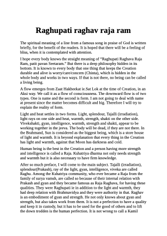 I hope every body knows the straight meaning of “Raghupati Raghava Raja Ram, patit pavan Seetaram.” But there is a deep philosophy hidden in its bottom. It is known to every body that one thing that keeps the Creation durable and alive is worry/care/concern (Chinta), which is hidden in the whole body and works in two ways. If that is not there, no being can be called a living being.