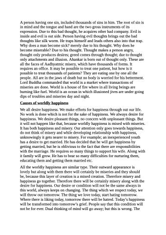 A person having one sin, included thousands of sins in him. The root of sin is in mind and the tongue and hand are the two gross instruments of its expression. Due to this bad thought, he acquires other bad company. Evil is inside and evil is out side. Person having evil thoughts brings out the bad thoughts like silk worm. He traps himself and leads others also into that trap. Why does a man become sick? merely due to his thought. Why does he become miserable? Due to his thought. Thought makes a person angry, thought only produces desires; greed comes through thought; due to thought only attachments and illusion. Ahankar is born out of thought only. These are all the faces of Aadhyatmic misery, which have thousands of forms. It requires an office. It may be possible to treat one patient, but how is it possible to treat thousands of patients? They are eating one by one all the people. All are in the jaws of death but no body is worried for his betterment. Lord Buddha commanded that world is a market where transactions of miseries are done. World is a house of fire where in all living beings are burning like fuel. World is an ocean in which illusioned jives are under going dips of troubles and miseries day and night.