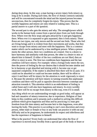 The second part is who gets the misery and why. The strength/power which works in the human body comes from a special place from our body through flow. Where ever the flow stops and gets attracted by it and gets happiness there. When ever it is separated or gets separated, then it feels misery. These flows are two types, one only moves and the second one feels. Those who feel are living beings and it is evident from their movements and works, that they want to escape from misery and meet with the happiness. This is a common matter which can be understood by a less intelligent person. When a person meets the other person, there two conditions are created. One is a desire to have harmony and similarity with that person, the other is a desire to mix or absorb him in himself. If either of the two conditions are not liked, then an effort to reject is seen. The first two conditions have happiness and the last condition will have misery. For example: when a foreign body enters the eye, then the power of feeling by the eye desires that it should become similar and be in harmony or get absorbed and mixing with it, become one or get separated completely. If the matter is absorbed then there will be no pain. If it could not be absorbed or could not become similar, there will be effort to reject it and there will be misery for the attention to work vigorously to reject it. Because the attention will have misery in turning towards this unpleasant condition and there will be pull in opposite direction between contempt and attraction towards it. This attention which is an embodiment of feeling is called Surat and it will also have happiness and misery. In every worldly work, there will be no escape from misery in this way, even if it is small.