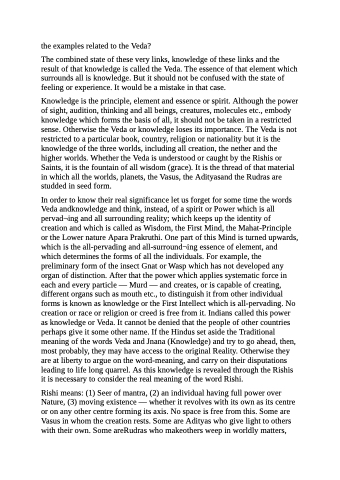 In order to know their real significance let us forget for some time the words Veda andknowledge and think, instead, of a spirit or Power which is all pervad¬ing and all surrounding reality; which keeps up the identity of creation and which is called as Wisdom, the First Mind, the Mahat-Principle or the Lower nature Apara Prakruthi. One part of this Mind is turned upwards, which is the all-pervading and all-surround¬ing essence of element, and which determines the forms of all the individuals. For example, the preliminary form of the insect Gnat or Wasp which has not developed any organ of distinction. After that the power which applies systematic force in each and every particle — Murd — and creates, or is capable of creating, different organs such as mouth etc., to distinguish it from other individual forms is known as knowledge or the First Intellect which is all-pervading. No creation or race or religion or creed is free from it. Indians called this power as knowledge or Veda. It cannot be denied that the people of other countries perhaps give it some other name. If the Hindus set aside the Traditional meaning of the words Veda and Jnana (Knowledge) and try to go ahead, then, most probably, they may have access to the original Reality. Otherwise they are at liberty to argue on the word-meaning, and carry on their disputations leading to life long quarrel. As this knowledge is revealed through the Rishis it is necessary to consider the real meaning of the word Rishi.