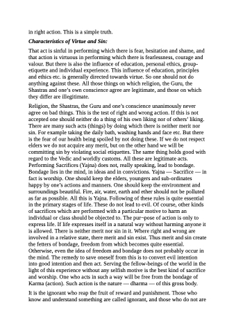 Religion, the Shastras, the Guru and one’s conscience unanimously never agree on bad things. This is the test of right and wrong action. If this is not accepted one should neither do a thing of his own liking nor of others’ liking. There are many such acts (things) by doing which there is neither merit nor sin. For example taking the daily bath, washing hands and face etc. But there is the fear of our health being spoiled by not doing these. If we do not respect elders we do not acquire any merit, but on the other hand we will be committing sin by violating social etiquettes. The same thing holds good with regard to the Vedic and worldly customs. All these are legitimate acts. Performing Sacrifices (Yajna) does not, really speaking, lead to bondage. Bondage lies in the mind, in ideas and in convictions. Yajna — Sacrifice — in fact is worship. One should keep the elders, youngers and sub-ordinates happy by one’s actions and manners. One should keep the environment and surroundings beautiful. Fire, air, water, earth and ether should not be polluted as far as possible. All this is Yajna. Following of these rules is quite essential in the primary stages of life. These do not lead to evil. Of course, other kinds of sacrifices which are performed with a particular motive to harm an individual or class should be objected to. The pur¬pose of action is only to express life. If life expresses itself in a natural way without harming anyone it is allowed. There is neither merit nor sin in it. Where right and wrong are involved in a relative state, there merit and sin exist. Thus merit and sin create the fetters of bondage, freedom from which becomes quite essential. Otherwise, even the idea of freedom and bondage does not probably occur in the mind. The remedy to save oneself from this is to convert evil intention into good intention and then act. Serving the fellow-beings of the world in the light of this experience without any selfish motive is the best kind of sacrifice and worship. One who acts in such a way will be free from the bondage of Karma (action). Such action is the nature — dharma — of this gross body.