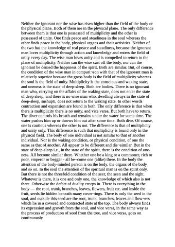 Neither the ignorant nor the wise has risen higher than the field of the body or the physical plane. Both of them are in the physical plane. The only difference between them is that one is possessed of multiplicity and the other is possessed of unity. One finds peace and steadiness in the soul whereas the other finds peace in the body, physical organs and their activities. Neither of the two has the knowledge of real peace and steadiness, because the ignorant man loves multiplicity through action and knowledge and enters the field of unity every day. The wise man loves unity and is compelled to return to the plane of multiplicity. Neither can the wise cast off the body, nor can the ignorant be denied the happiness of the spirit. Both are similar. But, of course, the condition of the wise man in compari¬son with that of the ignorant man is relatively superior because the gross body is the field of multiplicity whereas the soul is the field of unity. Multiplicity is the conscious and waking state, and oneness is the state of deep-sleep. Both are bodies. There is no ignorant man who, carrying on the affairs of the waking state, does not enter the state of deep sleep; and there is no wise man who, dwelling always in the state of deep-sleep, sushupti, does not return to the waking state. In other words contraction and expansion are found in both. The only difference is that when there is multiplicity there is no unity, and vice versa. But both have to return. The diver controls his breath and remains under the water for some time. The water pushes him up or throws him out after some time. Both dive. Of course, one is cautious whereas the other is not. The difference is that of multiplicity and unity only. This difference is such that multiplicity is found only in the physical field. The body of one individual is not similar to that of another individual. Nor is the waking condition, or physical condition, of one the same as that of another. All appear to be different and dis¬similar. But in the state of deep-sleep i.e., in the state of the spirit, there is the condition of one- ness. All become similar there. Whether one be a king or a commoner, rich or poor, emperor or beggar - all be¬come one (alike) there. In the body the attention of the body-minded person is on the body, the organs of the body and so on. In the soul the attention of the spiritual man is on the spirit only. But there is not the threefold condition of the seer, the seen and the sight. Whatever is there, it is one and only one, the knowledge of which also is not there. Otherwise the defect of duality creeps in. There is everything in the body — the root, trunk, branches, leaves, flowers, fruit etc. and inside the fruit, seeds lie hidden beneath many cover¬ings. There is only the seed in the soul, and outside this seed are the root, trunk, branches, leaves and flow¬ers which lie in a covered and contracted state at the top. The body always finds its expression and growth from the soul, and vice versa, in the same way as the process of production of seed from the tree, and vice versa, goes on continuously.