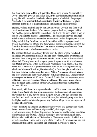 Brahma, Vishnu, Mahesh are the real and important Devatas and their total condition is that of Brahma. Who so ever prays to Brahma, merges in Him. But God has promised that He remembers His devotee in such of the group or society which is the place of Parabrahma. The opinion and advice of Khaja Saheb is that it is better to remember a devotee of God in the group of Hazrat Salley Allah Alley Basallam, not with the faith that He is a prophet and greater than followers of God and followers of prominent person, but with the faith that the existence and birth of Om Hazrat Rasooley Maqboolwas from that spiritual center, which was mentioned earlier.