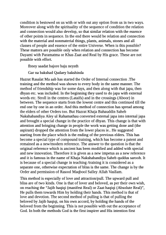 condition is bestowed on us with or with out any option from us in two ways. Moreover along with the spirituality of the sequence of condition the relation and connection would also develop, so that similar relation with the essence of other points in sequence. In the end there would be relation and connection with the material and nonmaterial things, plants, animals, stones and all classes of people and essence of the entire Universe. When is this possible? These matters are possible only when relation and connection has become Dayami with Paramatma or Khas Zaat and Real by His grace. These are not possible with effort.